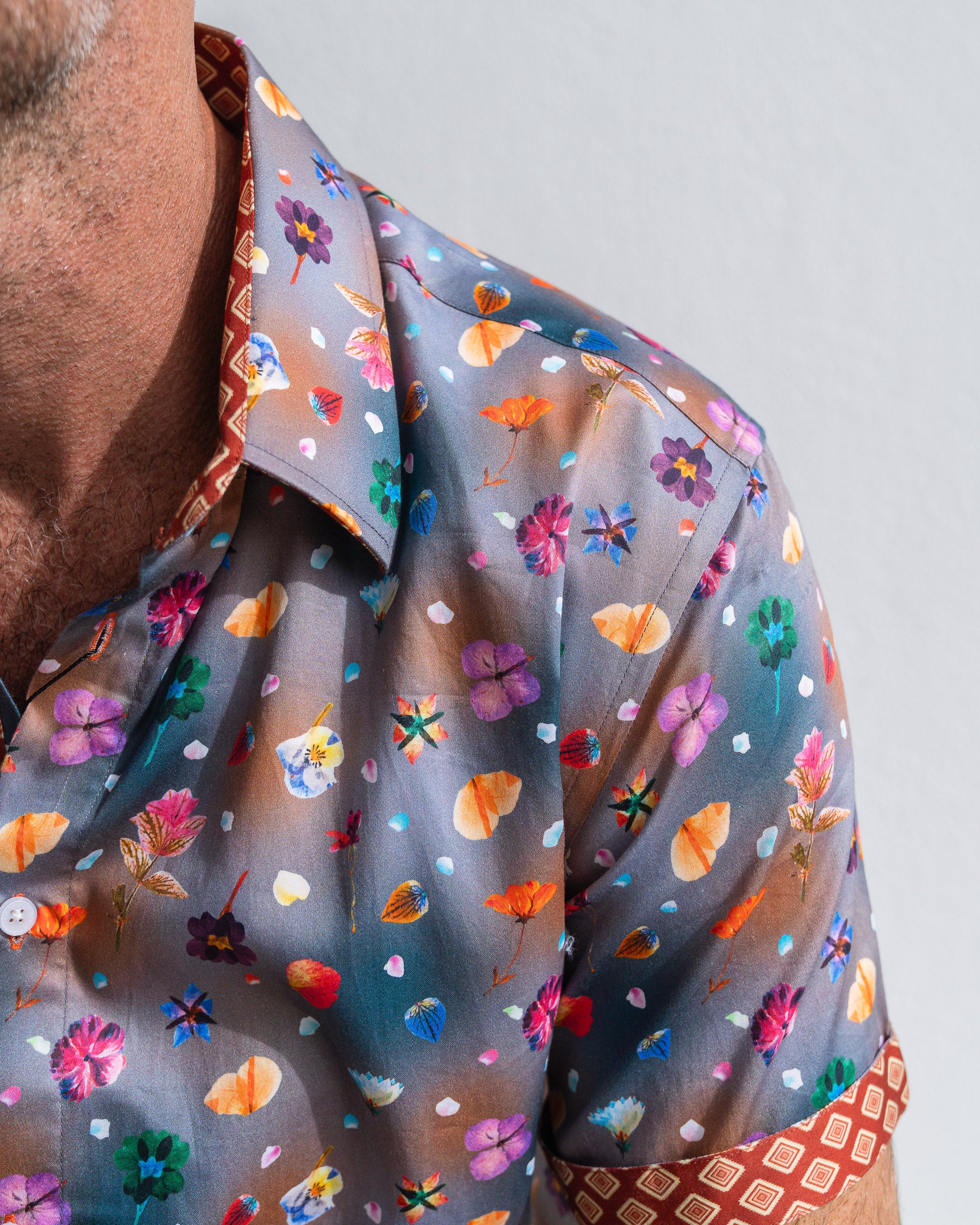 A soft grey short-sleeve shirt embellished with a flutter of vibrant colour petals. The internal contrast trim adds charm to this beautiful colour palette.