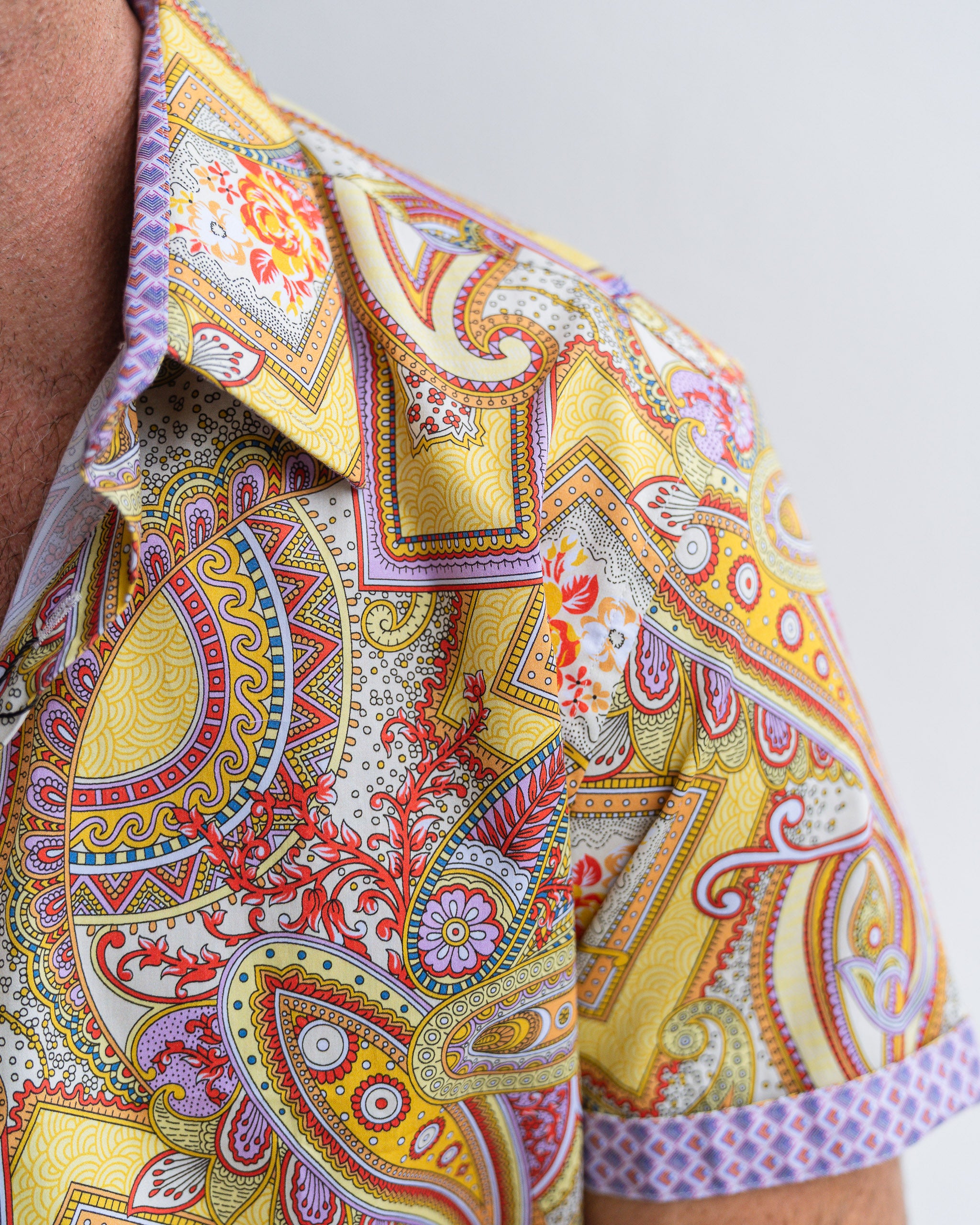 Sunshine personified, this vibrant intricate paisley pattern shirt is guaranteed to raise a smile! Pairs perfectly with dark indigo denim or grey and ecru chinos.